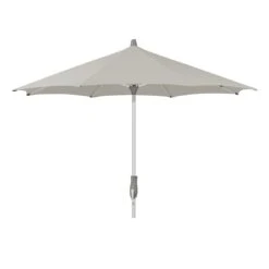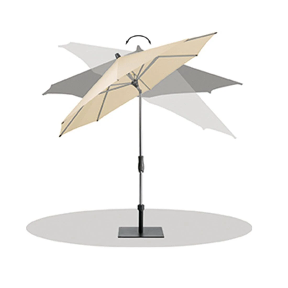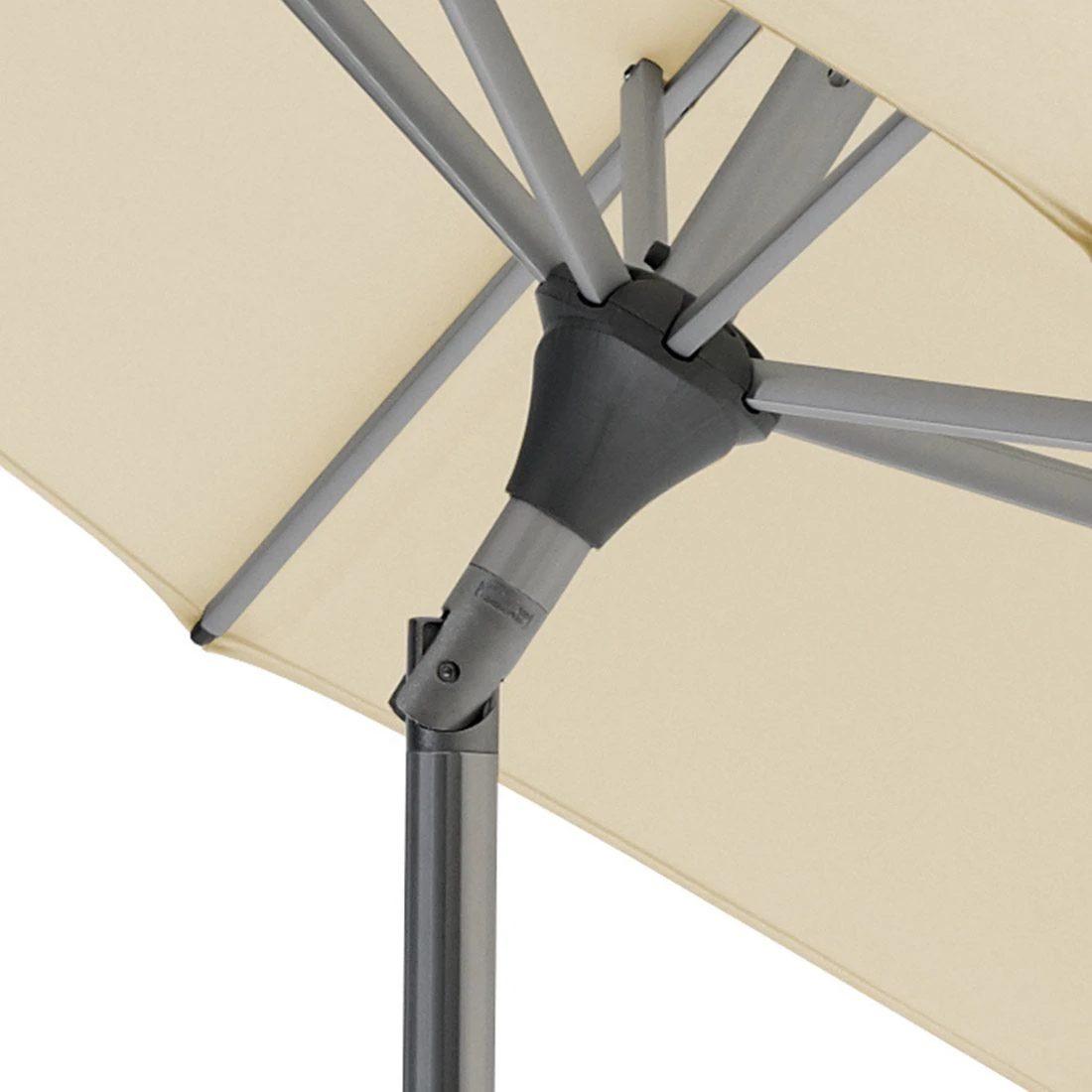 Material und Technik: Gestell und Streben sind aus Aluminium mit profiliertem Mast. Ein Kurbelantrieb sorgt für leichtes Öffnen des Schirms. Die Verstellung zur Neigung des Schirmdaches erfolgt mittels Drehrad oberhalb des Kurbelgehäuses. Der Schirmbezug ist auswechselbar und selbstspannend, dank den flexiblen Strebenenden.