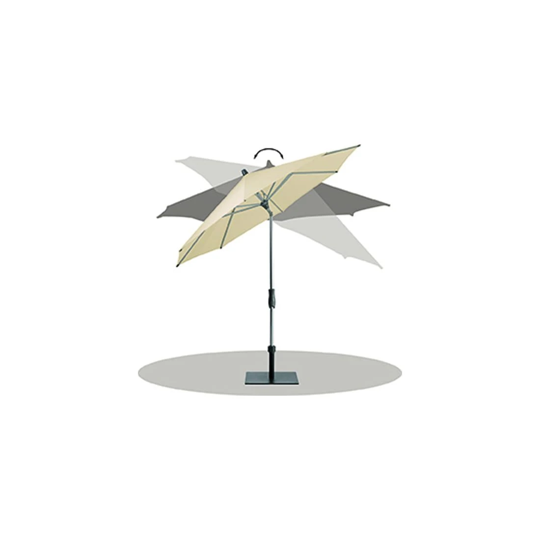 Material und Technik: Gestell und Streben sind aus Aluminium mit profiliertem Mast. Ein Kurbelantrieb sorgt fĂŒr leichtes Ăffnen des Schirms. Die Verstellung zur Neigung des Schirmdaches erfolgt mittels Drehrad oberhalb des KurbelgehĂ€uses. Der Schirmbezug ist auswechselbar und selbstspannend, dank den flexiblen Strebenenden.