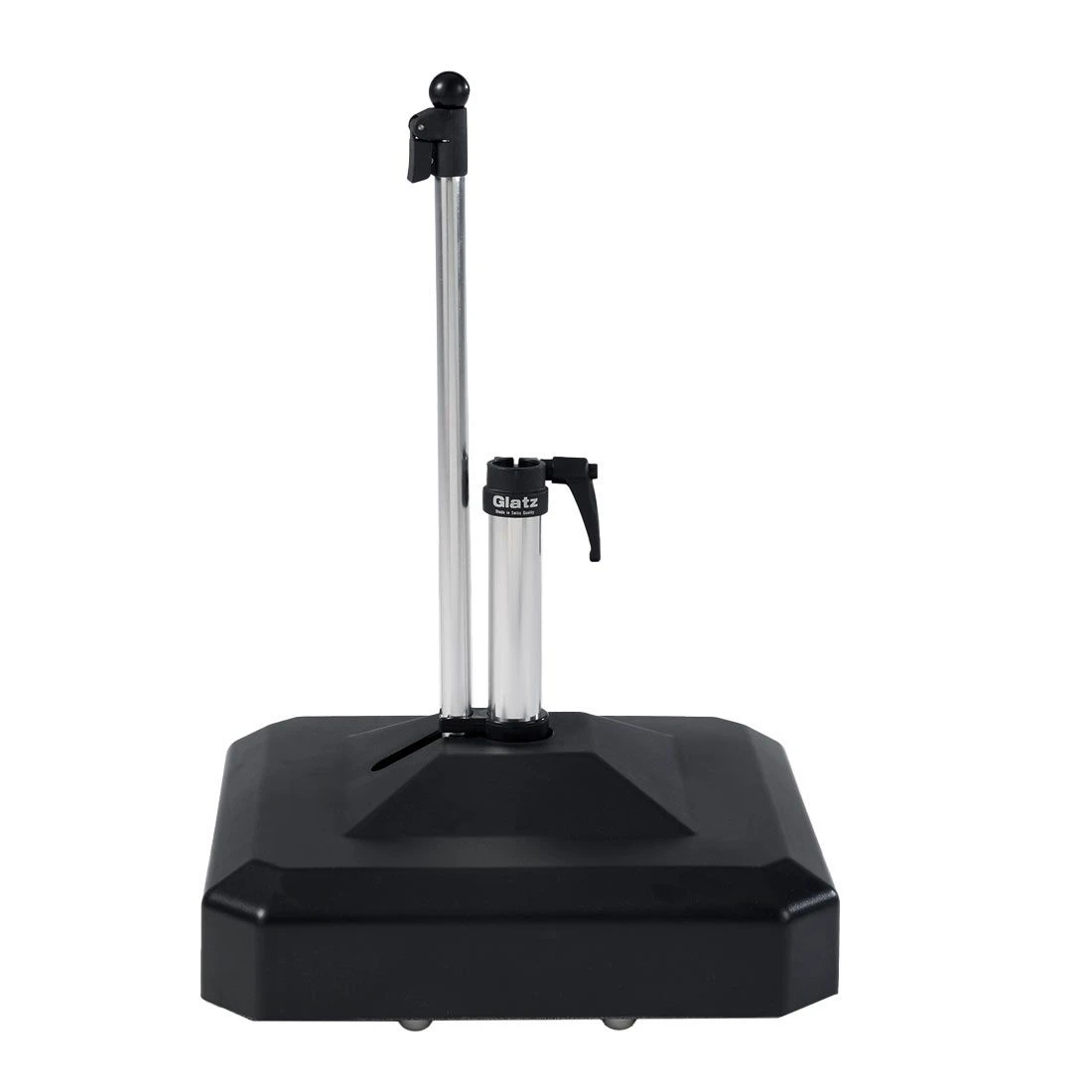 Dieser Rollensockel lÀsst sich anhand eines ausziehbaren Bedienhebels nach oben heben (die Rollen haben dadurch einen Freilauf) und bequem an einen anderen Standort fahren. Im abgesenkten Zustand bietet dieser SchirmstÀnder eine hohe Standfestigkeit.