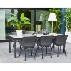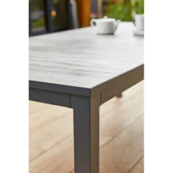 Das Gestell des eleganten Tisches ist aus Aluminium hergestellt. Farblich ist das Gestell in Dunkelgrau gehalten. Für ein stimmiges Gesamtbild erscheint die Platte in der Farbe Grau. Als klassische Design-Komponente fungiert das geradlinige Vierfußgestell. Das Design des Gartentisches ist klassisch rechteckig gestaltet.