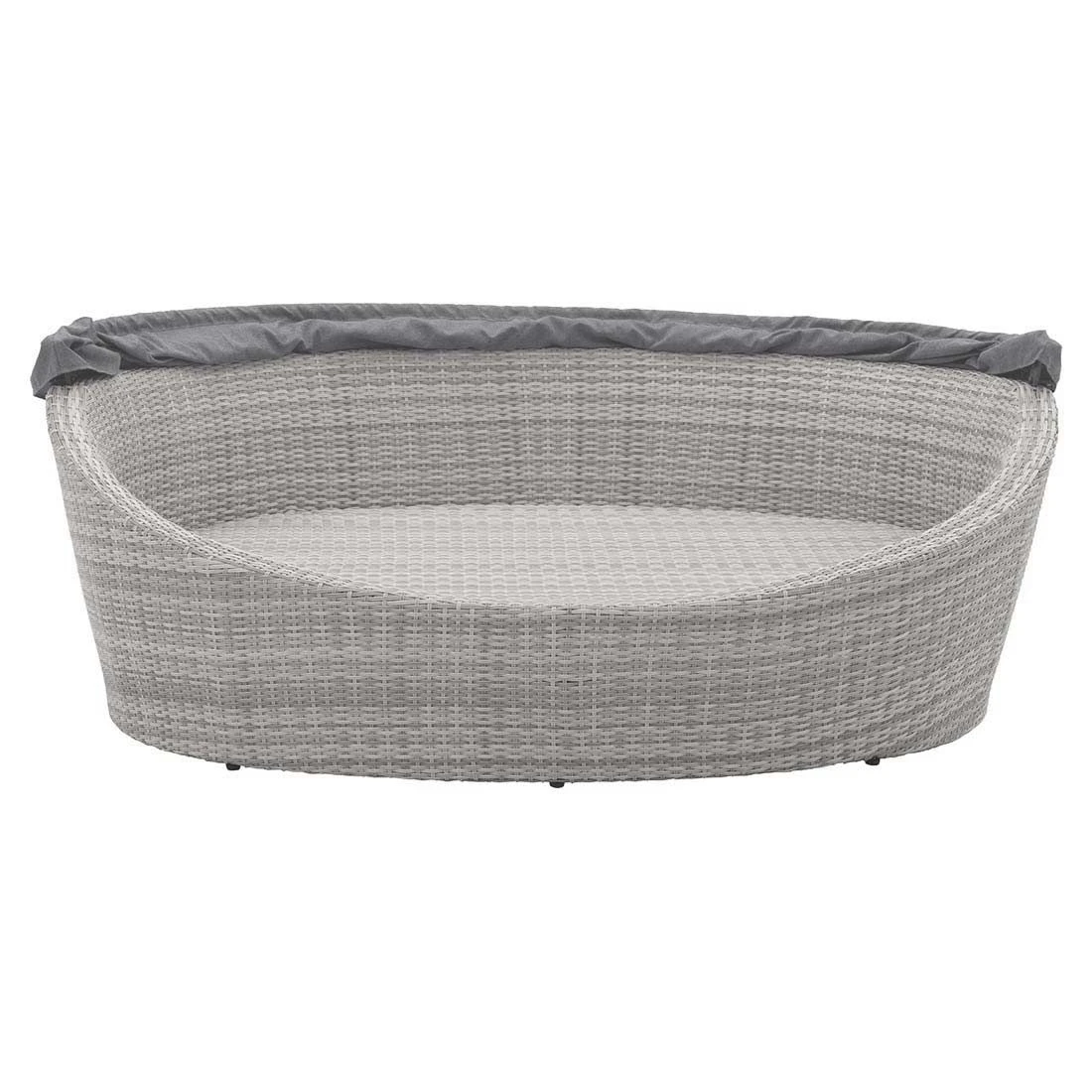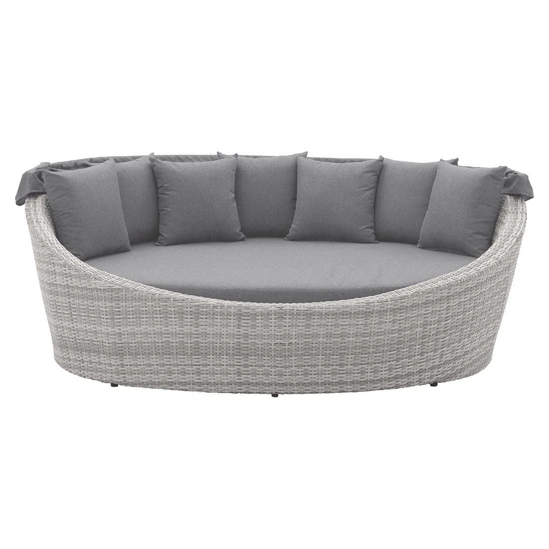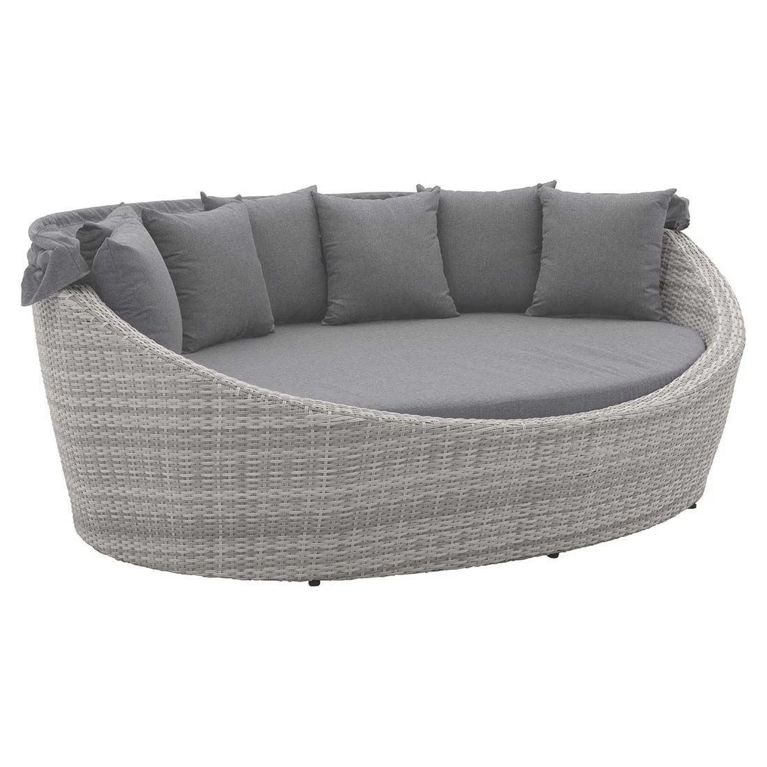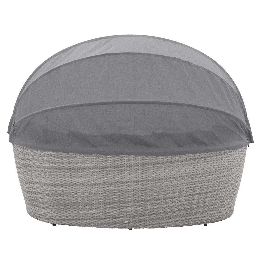 Der Bezug der Sonneninsel ist aus Polyester gefertigt. Auch wenn diese Wind und Wetter trotzen, empfehlen wir die abnehmbaren Kissen bei länger andauernder Feuchtigkeit drinnen zu lagern.