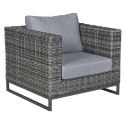 Das Gestell besteht aus pflegeleichtem und wetterfestem Aluminium in der Farbe Anthrazit. Die Sitzfläche des Loungesessels besteht aus modernem Polyrattan. Ein Material, das sich durch seine lange Haltbarkeit auszeichnet. Als hochwertiges Material für den Bezug kommt ein Polyester-Stoff zum Einsatz. Er ist sehr strapazierfähig und bietet somit die idealen Voraussetzungen für den Einsatz im Freien. Farblich begeistern die Bezüge in elegantem Salz & Pfeffer. Das robuste Kufengestell lässt sich hervorragend in moderne Stile integrieren. Die Sitzbreite von 62 cm und die Sitztiefe von 72 cm machen den Loungesessel besonders komfortabel. Die Sitzhöhe liegt zudem bei angenehmen 30 cm.