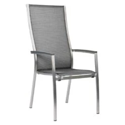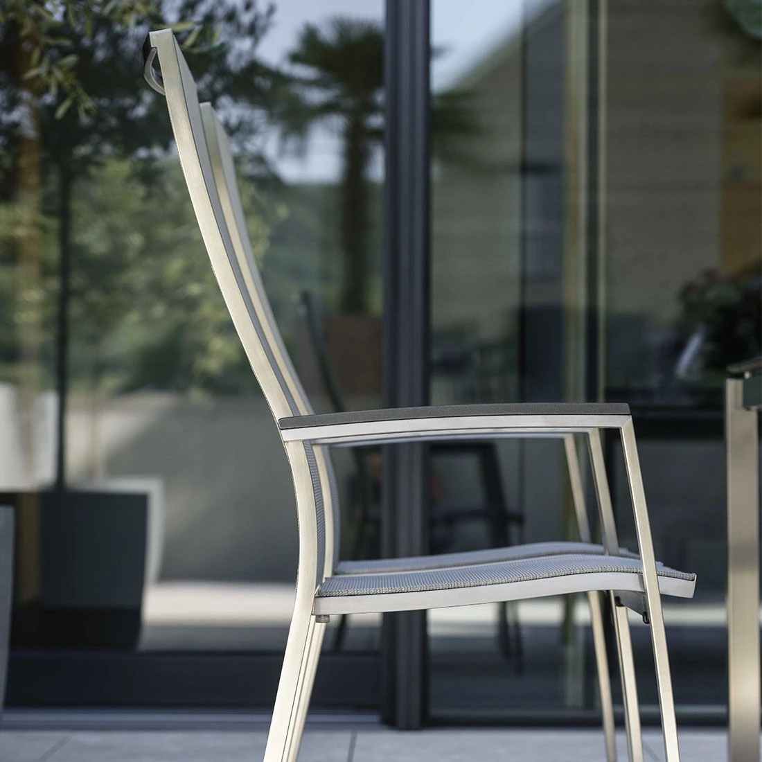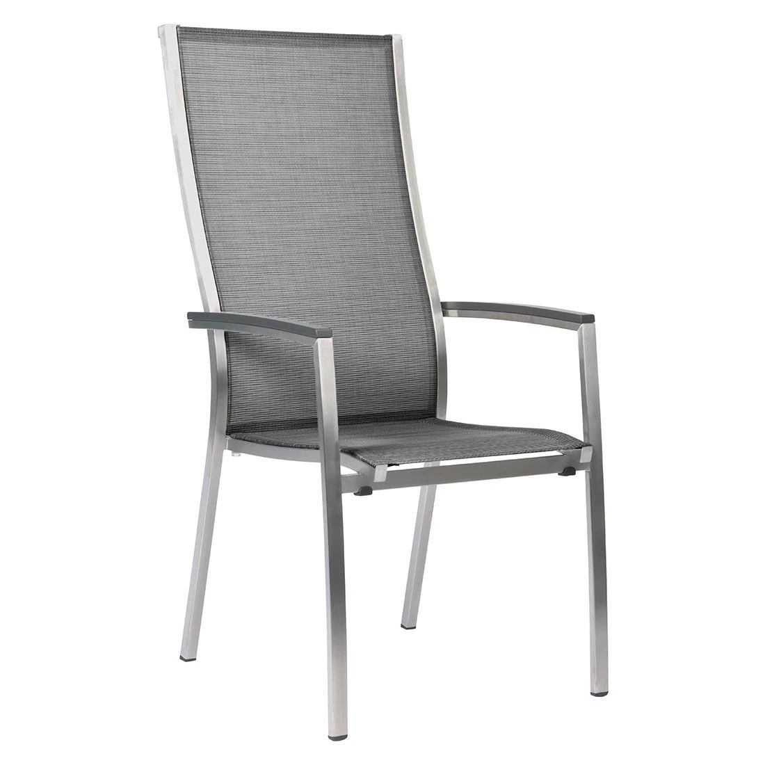 Ein weiterer Pluspunkt des Stapelsessels ist die Bespannung mit Textilene in der Farbe Silbergrau. Dieser Bezugsstoff ĂŒberzeugt durch eine hohe Robustheit gegenĂŒber Hitze und Frost aus und ist leicht zu reinigen. Besonders praktisch: Aufeinander gestapelt können auch mehrere Exemplare des Stapelsessels platzsparend aufbewahrt werden. Der hohe Sitzkomfort ergibt sich auch aus der Sitzbreite von 44 cm und einer Sitztiefe von 46 cm. UnterstĂŒtzt wird dies zudem durch die bequeme Sitzhöhe von 45 cm.