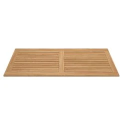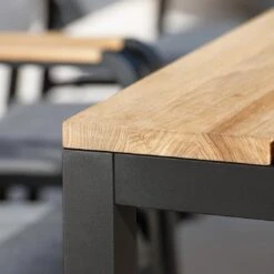 Mit seinem Gestell-Material Aluminium zählt der Gartentisch zu den modernen Tischmodellen, die sich auf der Terrasse ganz einfach aufstellen und bewegen lassen. Als Material für die Tischplatte wird das besonders hochwertige Hartholz Teak verwendet. Die Maserung dieses Holzes und der warme Farbton integrieren sich hervorragend in jegliche Arten der Garten- und Balkongestaltung und sorgen für eine besonders natürliche Atmosphäre. Farblich ist die Tischplatte in einem schönen Natur gehalten. Mit der rechteckigen Form lässt sich der Gartentisch platzsparend in Ecken oder an Häuserwänden aufstellen.