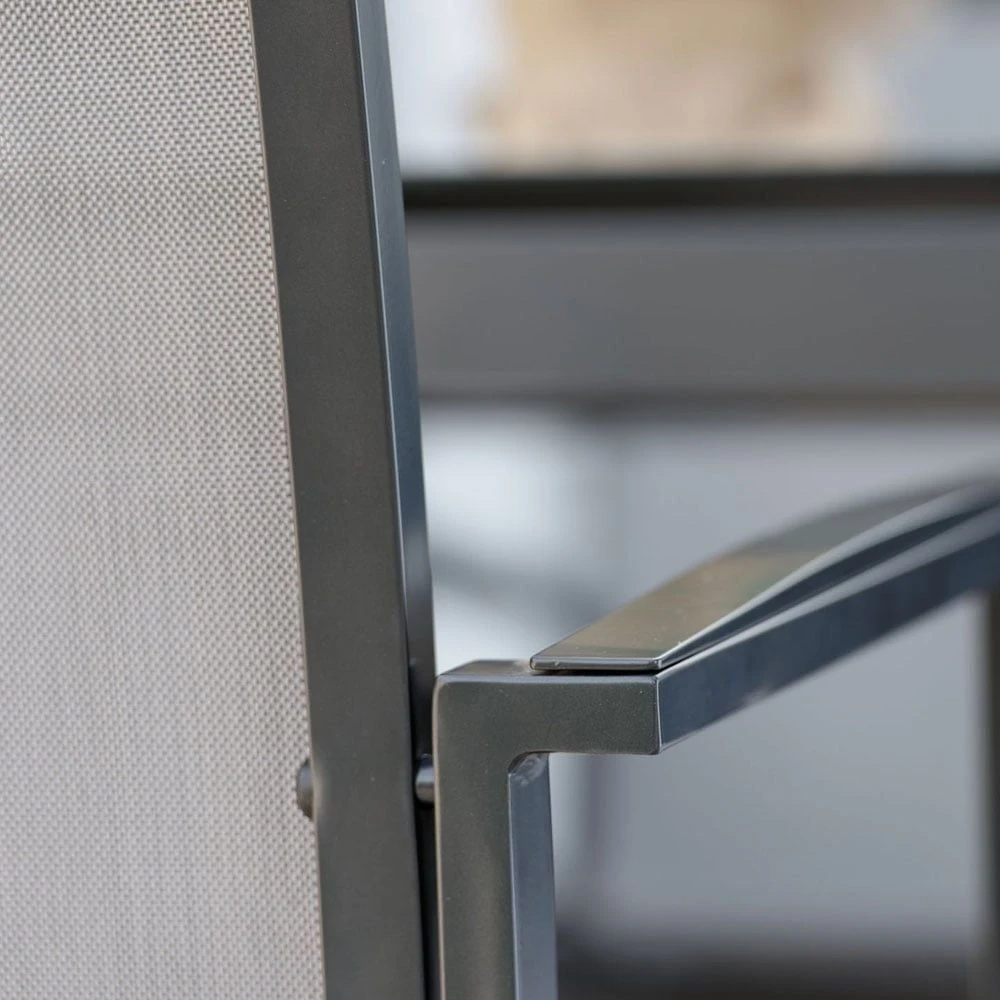 Die Sitzfläche und der Bezug bestehen aus Textilene. Damit der Stapelsessel optisch ansprechend ist, sind die Sitzfläche und der Bezug im Farbton Silber gehalten. Das Gestell wird aus Aluminium gefertigt. Das geringe Eigengewicht des Materials macht den Stapelsessel zu einem robusten, aber dennoch leicht zu transportierenden Sitzmöbel auf Ihrer Terrasse. Für eine attraktive Optik ist das Gestell im Farbton Anthrazit gehalten.