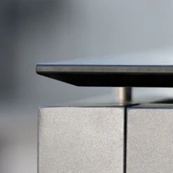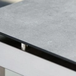 Die langlebige Tischplatte besteht aus Silverstar. Dieses Material wird aus bis zu 50 Lagen Papierlaminatschichten gefertigt, die unter großer Hitze und hohem Druck verpresst werden. Diese Technik verleiht der Tischplatte ganz besondere Eigenschaften, denn sie ist kratzfest, kälte- (-20 °C) und hitzebeständig (180 °C), UV-beständig, pflegeleicht und abriebfest. Unabhängig von der Vielzahl an Dekoren ist der Kern immer schwarz, was man an der Kante der Platte erkennen kann. Für ein stimmiges Gesamtbild erscheint die Platte in der Farbe Zement.